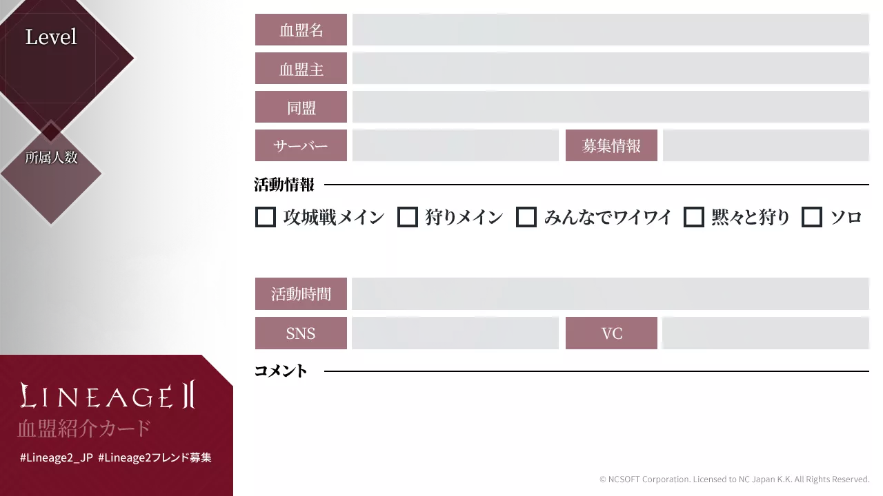 ※血盟のアピールや、活動スタイルの詳細などは自由コメント欄にご入力ください。